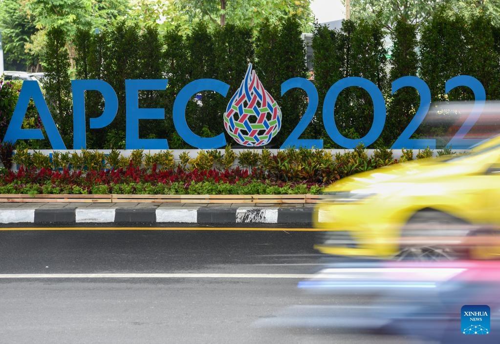 This photo taken on Nov. 14, 2022 shows a logo of APEC 2022 in Bangkok, Thailand. The 29th Asia-Pacific Economic Cooperation (APEC) Economic Leaders' Meeting will be held in Bangkok, Thailand, on Nov. 18-19. (Xinhua/Guo Lei)