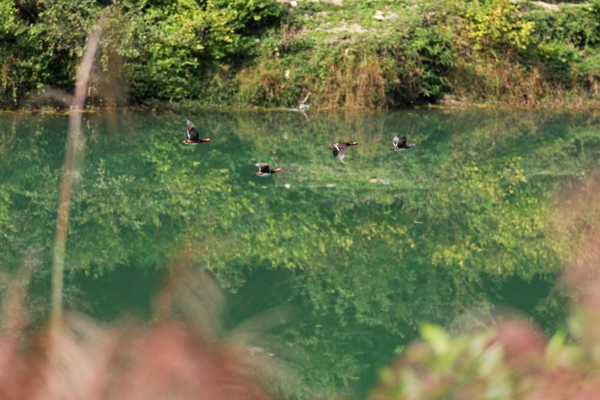 Mandarin ducks blend in perfectly with the lucid waters and lush mountains in Pengshui Miao and Tujia Autonomous County, southwest China's Chongqing. (Photo/Zhao Yong)