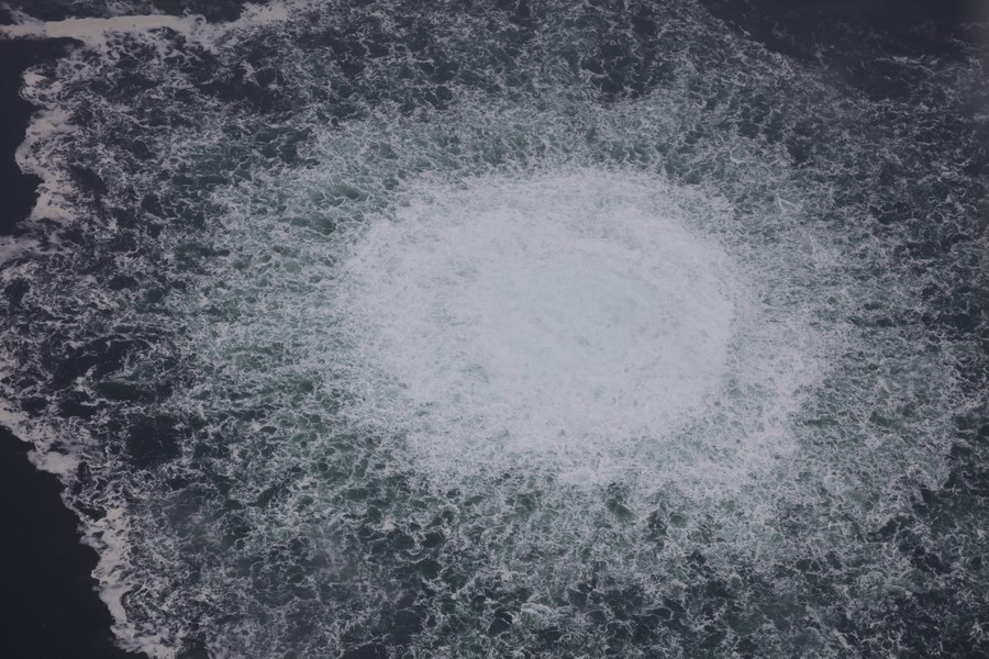 Aerial photo provided by the Swedish Coast Guard on Sept. 28, 2022 shows a gas leak on the Nord Stream 1 pipeline. (The Swedish Coast Guard/Handout via Xinhua)