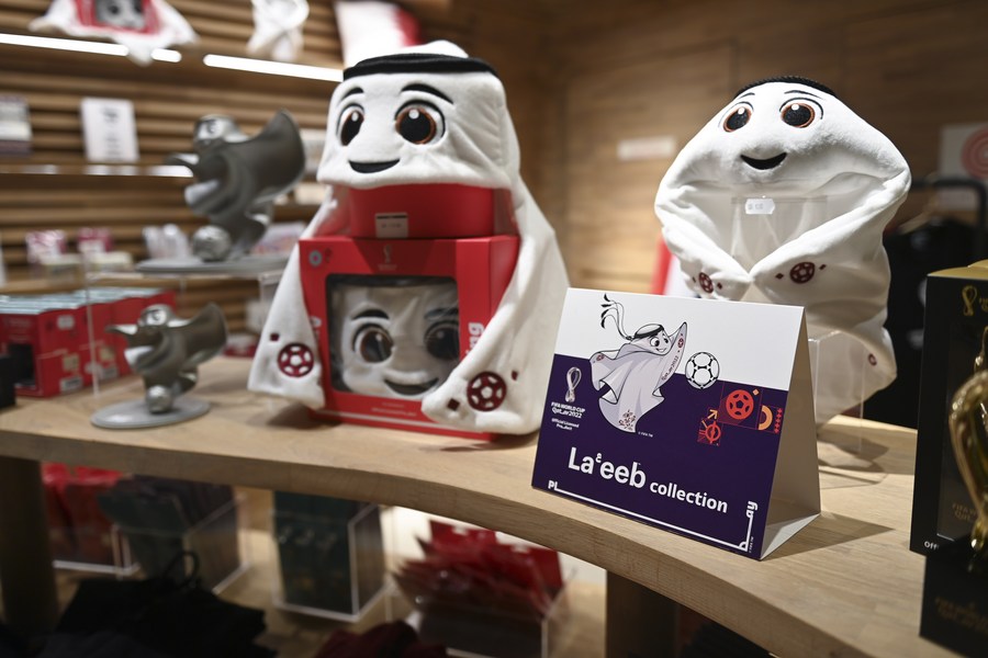FIFA World Cup Qatar 2022 mascot products are displayed at a gift shop at the Qatar National Museum in Doha, Qatar, Nov. 13, 2022. (Photo by Nikku/Xinhua)