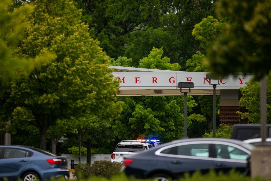 Police vehicles are seen at North Shore Hospital in Highland Park,Illinois, the United States, July 4, 2022. (Photo by Vincent Johnson/Xinhua)