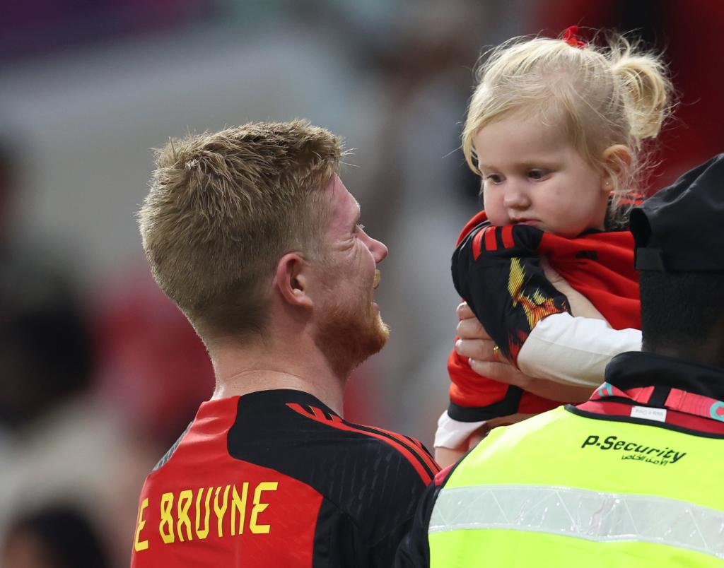 Kevin de Bruyne (L) of Belgium holds his daughter Suri after the Group F match between Belgium and Canada at the 2022 FIFA World Cup at Ahmad Bin Ali Stadium in Al Rayyan, Qatar, Nov. 23, 2022. (Xinhua/Han Yan)