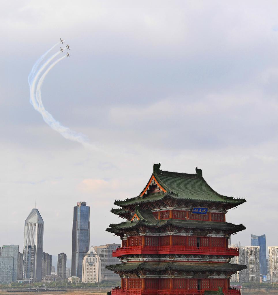 Aircrafts from a South African aerobatics team leave trails of smoke when performing above the Tengwang Pavilion in downtown Nanchang, capital of east China's Jiangxi Province, Nov. 23, 2022. (Xinhua/Wan Xiang)