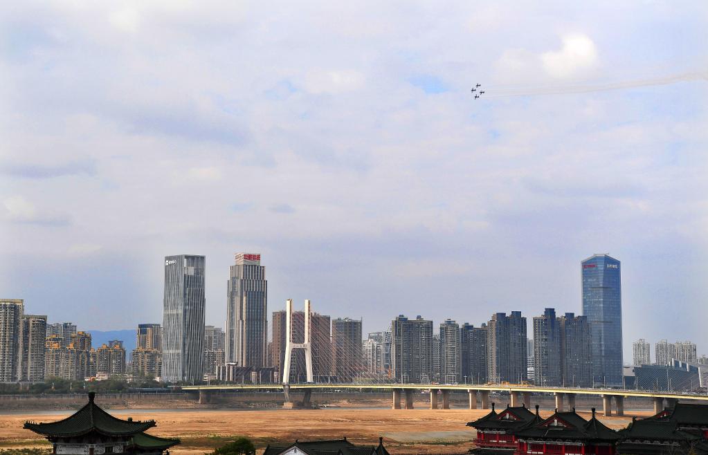 Aircrafts from a South African aerobatics team leave trails of smoke when performing above downtown Nanchang, capital of east China's Jiangxi Province, Nov. 23, 2022. (Xinhua/Wan Xiang)