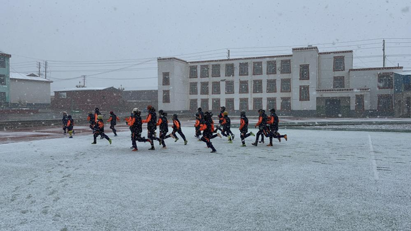 Members of a football team in Qumalai county train in the cold weather. (Photo/Sun Hai)