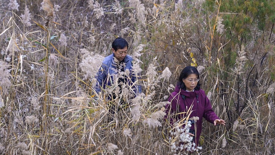 Liu Zhenjie (front) patrols a reed field by the Hengshui Lake in Hengshui City, north China's Hebei Province, Nov. 18, 2022. (Xinhua)