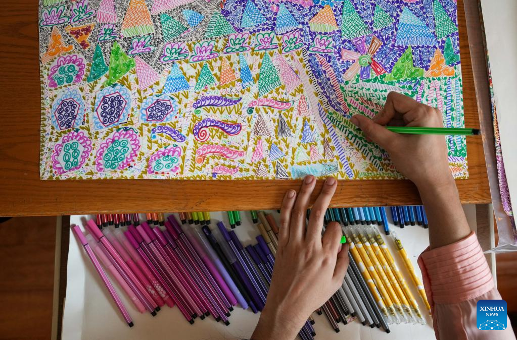 Gurmehar Singh creates a painting at home in north China's Tianjin, Nov. 22, 2022. (Xinhua/Li Ran)