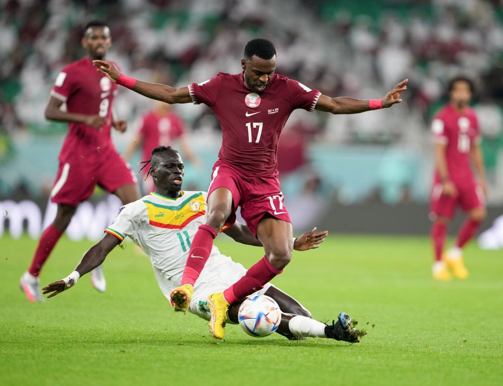 Ismail Mohamad (R) of Qatar vies with Pathe Ciss (bottom) of Senegal during the Group A match between Qatar and Senegal at the 2022 FIFA World Cup at Al Thumama Stadium in Doha, Qatar, Nov. 25, 2022. (Xinhua/Zheng Huansong)