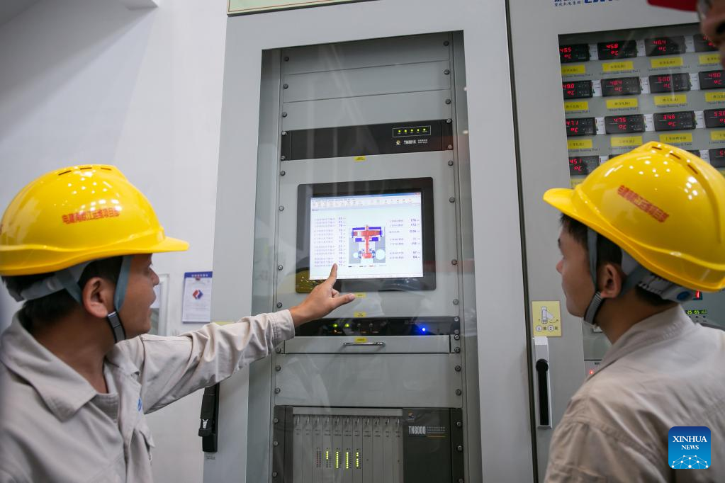 Staff members of PowerChina work at the Nam Ou 7 hydropower plant of the Nam Ou River Cascade Hydropower Project in northern Laos' Phongsaly Province, on Sept. 27, 2022. The Nam Ou river cascade hydropower project invested and built by the Power Construction Corporation of China (PowerChina) has brought development opportunities to the remote hilly regions in northern Laos. (Photo by Kaikeo Saiyasane/Xinhua)
