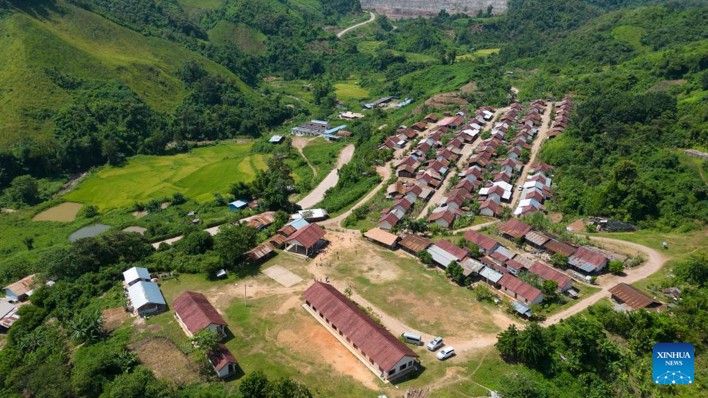This aerial photo taken on Sept. 27, 2022 shows the new resettlement village near the Nam Ou 7 hydropower plant of the Nam Ou River Cascade Hydropower Project in northern Laos' Phongsaly Province. The Nam Ou river cascade hydropower project invested and built by the Power Construction Corporation of China (PowerChina) has brought development opportunities to the remote hilly regions in northern Laos.(Photo by Kaikeo Saiyasane/Xinhua)