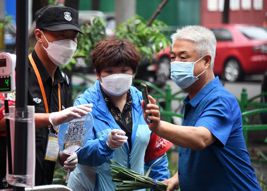 This file photo shows a resident scan a QR code to register his health status at the entrance of a community in Zhongguancun of Haidian District, Beijing, June 12, 2022. (Xinhua/Ren Chao)