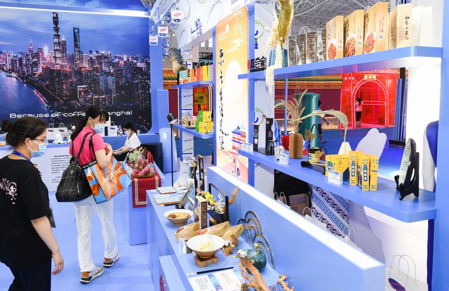 Visitors view exhibits at the booth of Zhenchangjia, a brand of Yuyuan Inc., at the second China International Consumer Products Expo (CICPE) in Haikou, south China's Hainan Province, July 26, 2022. (Xinhua/Yang Guanyu)