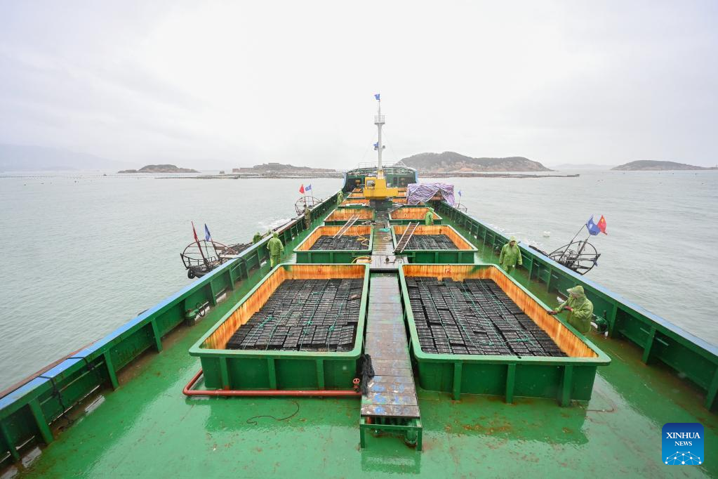 Fishermen transfer abalones from transport vessels to a breeding base in Lianjiang County of southeast China's Fujian Province, Nov. 25, 2022. (Xinhua/Zhou Yi)