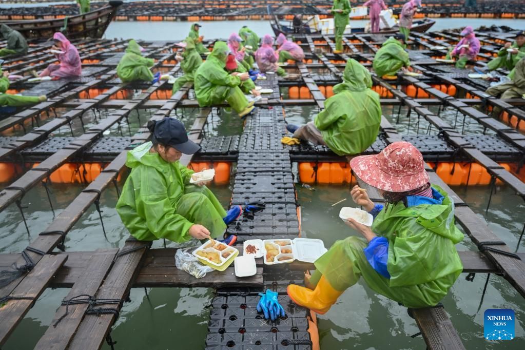 Fishermen have their meal at an abalone breeding base on the sea in Lianjiang County, southeast China's Fujian Province, Nov. 25, 2022. (Xinhua/Zhou Yi)