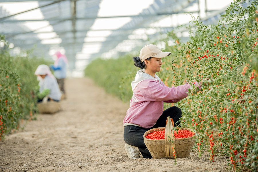 Workers pick goji berries growing in soil under solar panels at the Baofeng farming-light integrated photovoltaic power station in northwest China's Ningxia Hui Autonomous Region, July 24, 2021. (Xinhua)