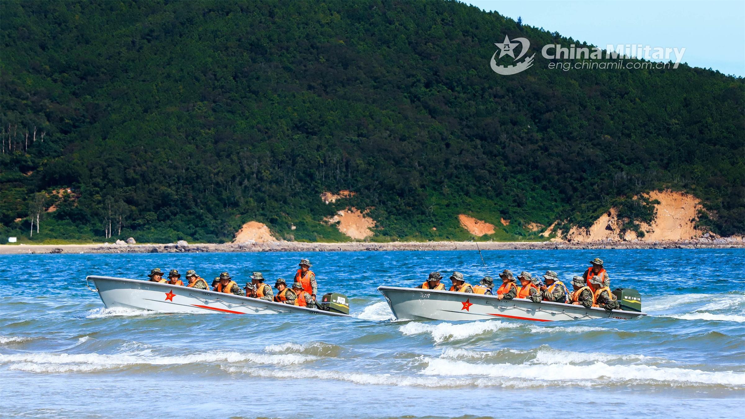 Marines assigned to a brigade of the PLA Navy's Marine Corps conduct forward movement for barrier breaching in assault boats during a maritime offense and defense training exercise recently. (eng.chinamil.com.cn/Photo by Tang Ruijie)