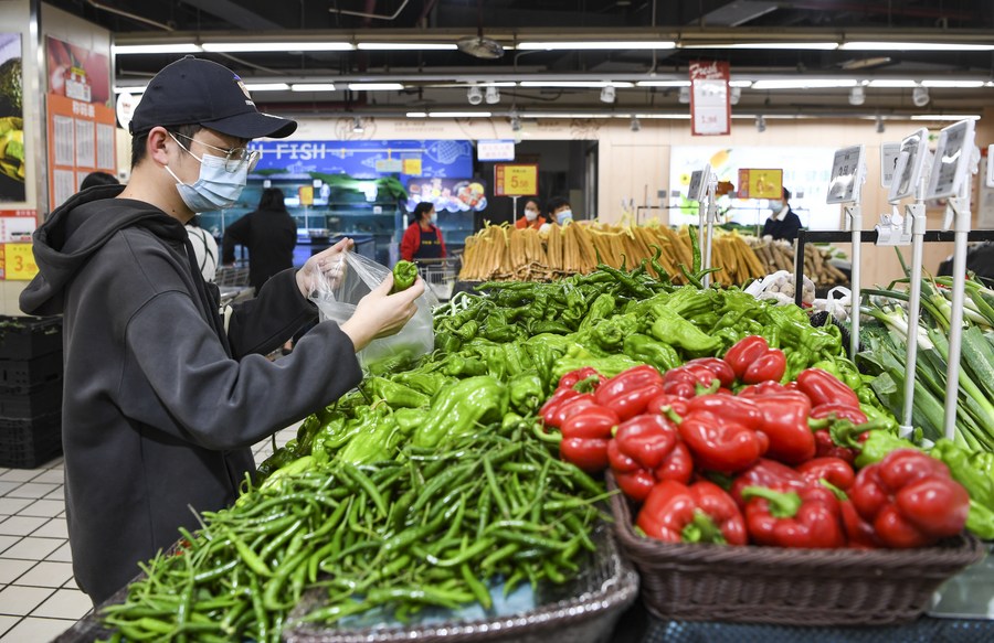 A customer selects vegetables at a supermarket in southwest China's Chongqing, Nov. 12, 2022. (Xinhua/Wang Quanchao)