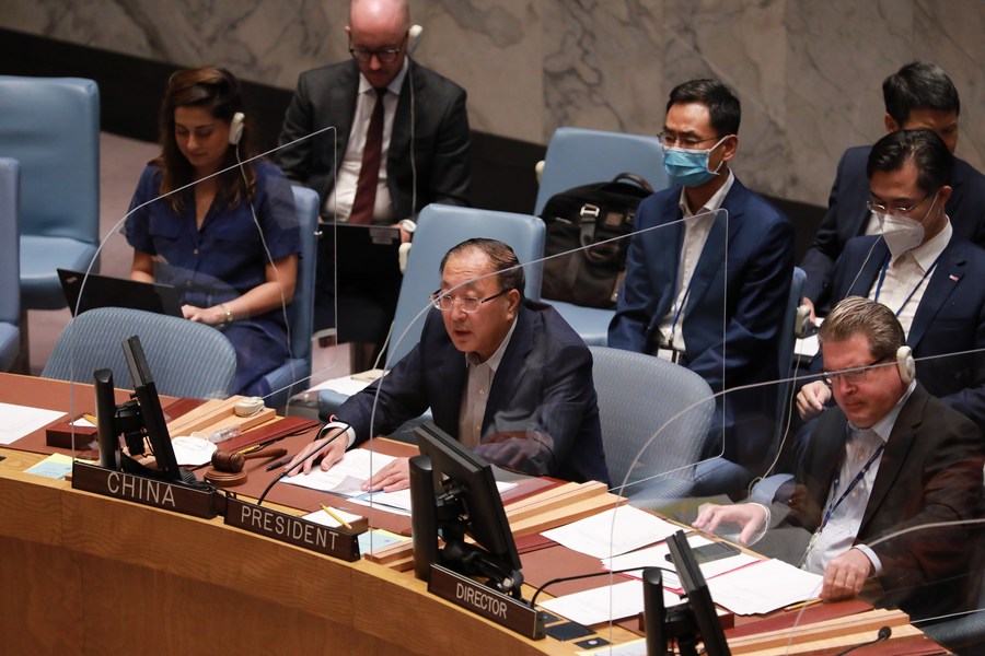 Zhang Jun (C), China's permanent representative to the United Nations, speaks at a UN Security Council meeting on the situation in the Middle East, including the Palestinian question, at the UN headquarters in New York, on Aug. 25, 2022. (Xinhua/Xie E)