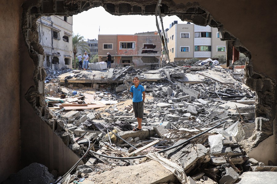 A Palestinian boy stands on the rubbles of his house which was damaged by Israeli airstrike in Gaza City, on Aug. 9, 2022. (Photo by Rizek Abdeljawad/Xinhua)