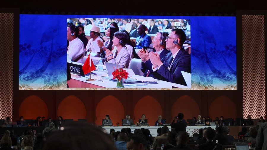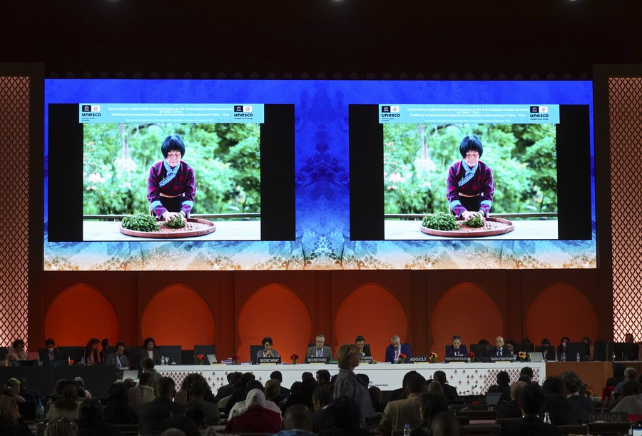 The item "Traditional tea processing techniques and associated social practices in China" is examined during the 17th session of the UNESCO Intergovernmental Committee for the Safeguarding of the Intangible Cultural Heritage in Rabat, Morocco, Nov. 29, 2022. (Xinhua/Xu Supei)