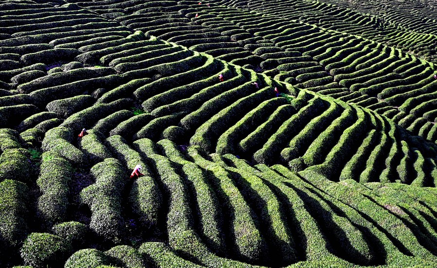Villagers pick tea leaves at a tea garden in Mianxian County of Hanzhong City, northwest China's Shaanxi Province, April 19, 2022. (Xinhua/Tao Ming)