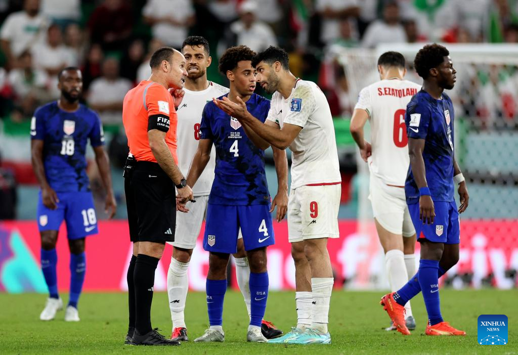 Mehdi Taremi (3rd R) of Iran communicates with referee Antonio Mateu Lahoz during the Group B match between Iran and the United States at the 2022 FIFA World Cup at Al Thumama Stadium in Doha, Qatar, Nov. 29, 2022. (Xinhua/Xu Zijian)