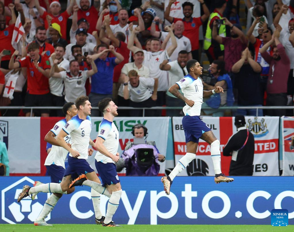 Marcus Rashford (1st R) of England celebrates scoring during the Group B match between Wales and England at the 2022 FIFA World Cup at Ahmad Bin Ali Stadium in Al Rayyan, Qatar, Nov. 29, 2022. (Xinhua/Li Ming)