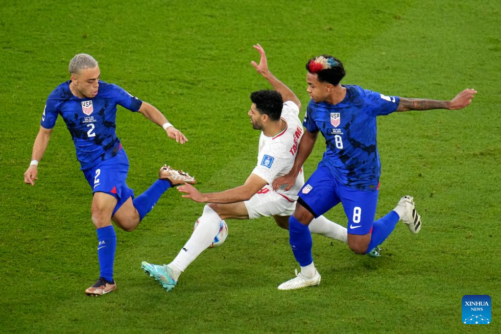 Mehdi Taremi (C) of Iran vies with Sergino Dest (L) and Weston McKennie of the United States during the Group B match between Iran and the United States at the 2022 FIFA World Cup at Al Thumama Stadium in Doha, Qatar, Nov. 29, 2022. (Xinhua/Meng Dingbo)