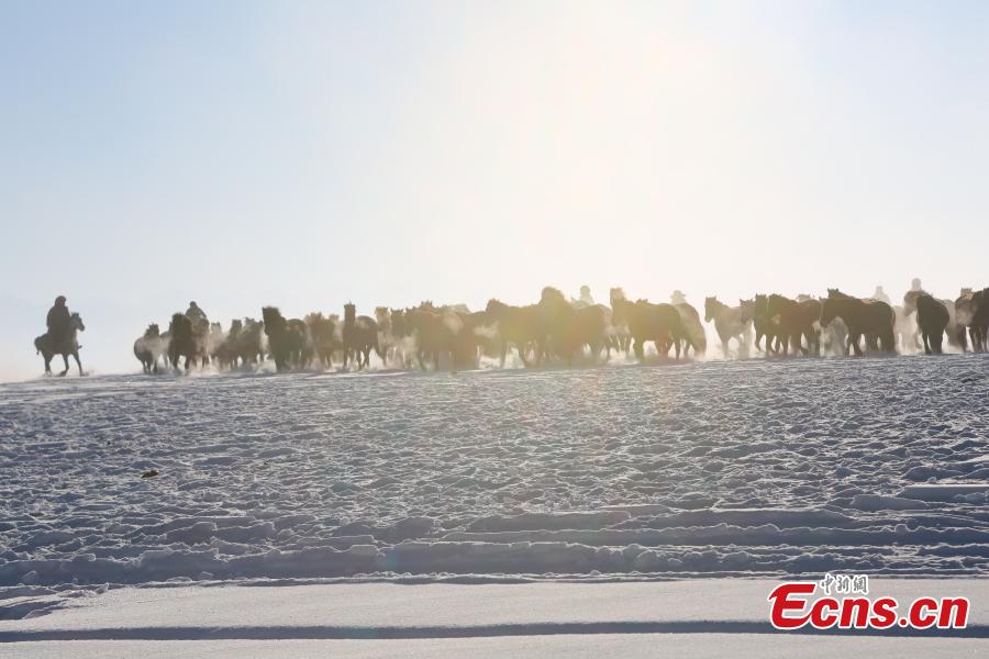 Horses run on snow-covered prairie in Xinjiang (3)