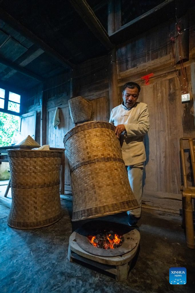 Zhang Yuehua dries newly-picked tea leaves at his ancestral house in Mingshan District of Ya'an City, southwest China's Sichuan Province, March 31, 2022. Zhang, born in 1959, is a representative inheritor of green tea making technique. Boasting a long history of tea cultivation, Ya'an is the birthplace of dark tea and green tea making techniques. Inherited by generations of tea makers, both techniques are now listed as national-level intangible cultural heritage. (Xinhua/Shen Bohan)