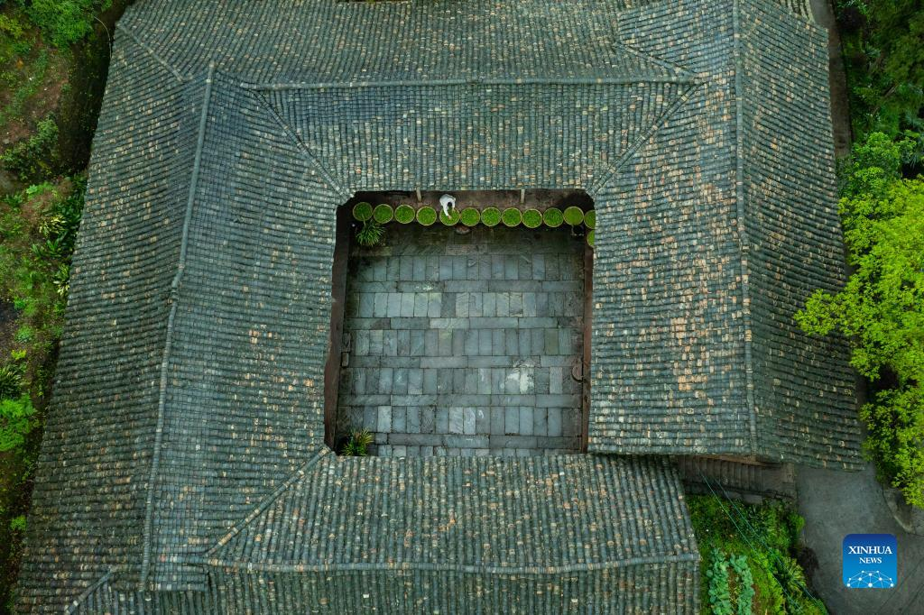 This aerial photo taken on March 31, 2022 shows Zhang Yuehua drying newly-picked tea leaves at his ancestral house in Mingshan District of Ya'an City, southwest China's Sichuan Province. Zhang, born in 1959, is a representative inheritor of green tea making technique. Boasting a long history of tea cultivation, Ya'an is the birthplace of dark tea and green tea making techniques. Inherited by generations of tea makers, both techniques are now listed as national-level intangible cultural heritage. (Xinhua/Shen Bohan)