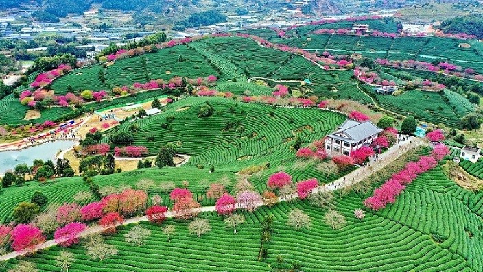 The construction of eco-friendly tea plantations also drives the development of relevant industries. "The oriental cherries planted in the plantations not only improved ecology but also the scenery of plantations, which makes tea-themed tourism possible," Fang said.