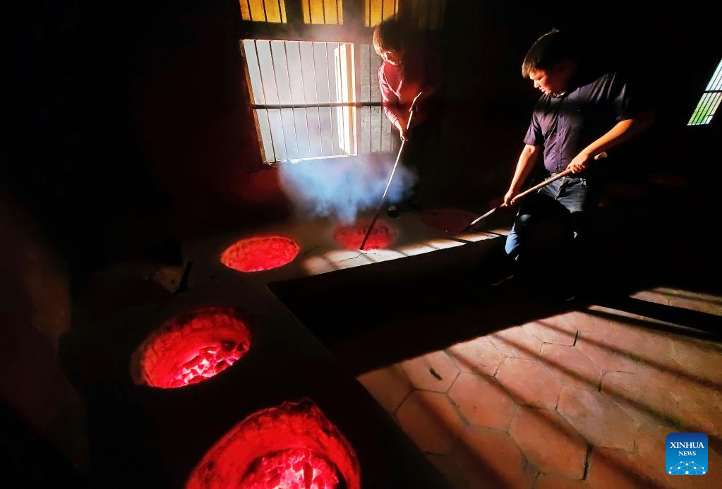 You Yuqiong (L), the only female inheritor of Wuyi rock tea making technique, instructs her son Fang Zhou (C) in the roasting technique of Wuyi rock tea in Wuyishan, southeast China's Fujian Province, Dec. 1, 2022. (Xinhua/Wei Peiquan)