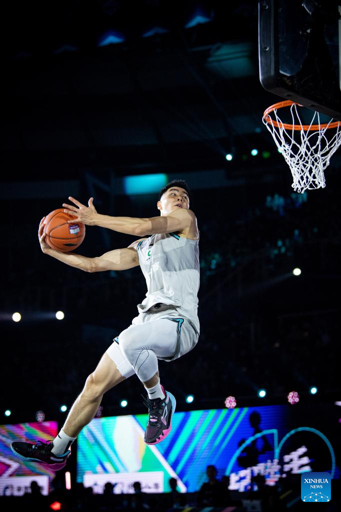 Li Tianrong of Shanghai Sharks dunks during the Slam Dunk Contest final at 2022 CBA All-Star Weekend in Zhuji, east China's Zhejiang Province, Dec. 3, 2022. (Xinhua/Jiang Han)