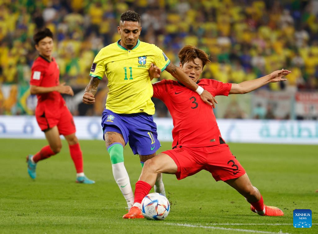 Kim Jin-su (R) of South Korea vies with Raphinha of Brazil during their Round of 16 match at the 2022 FIFA World Cup at Ras Abu Aboud (974) Stadium in Doha, Qatar, Dec. 5, 2022. (Xinhua/Wang Lili)