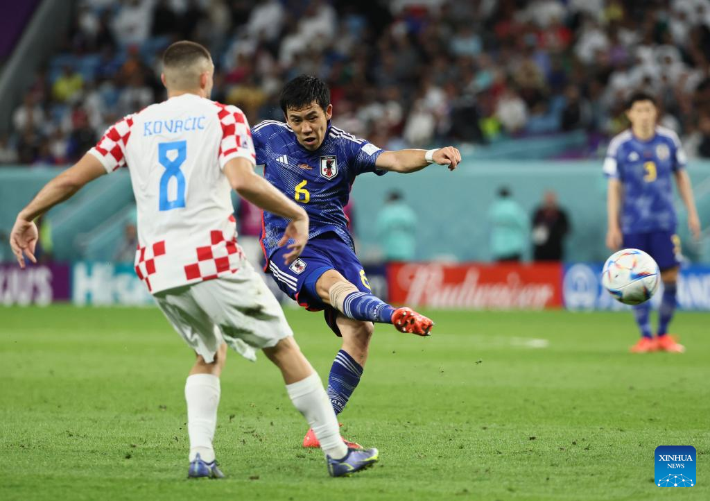 Ito Junya of Japan (C) vies for the ball during the Round of 16 match between Japan and Croatia at the 2022 FIFA World Cup at Al Janoub Stadium in Al Wakrah, Qatar, Dec. 5, 2022. (Xinhua/Li Ming)
