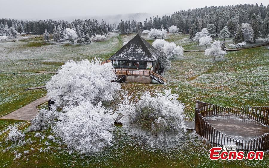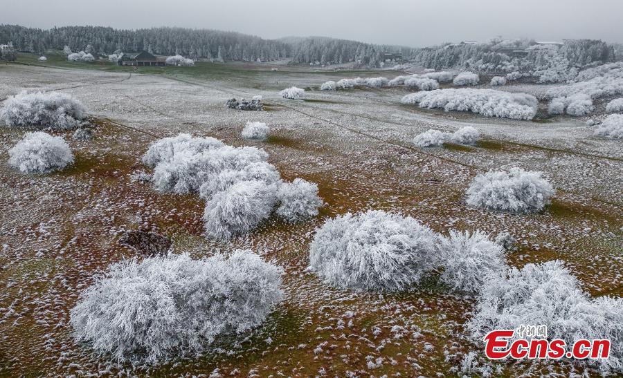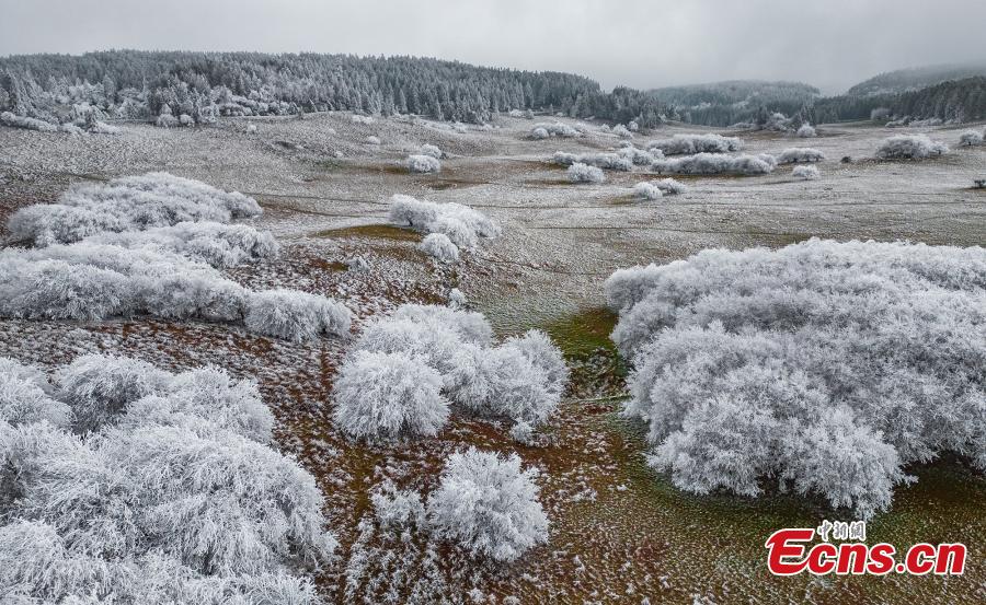 Trees are decorated with rime on Fairy Mountain in southwest China's Chongqing, turning the mountain range a winter wonderland. (Photo: China News Service/Wang Junjie)