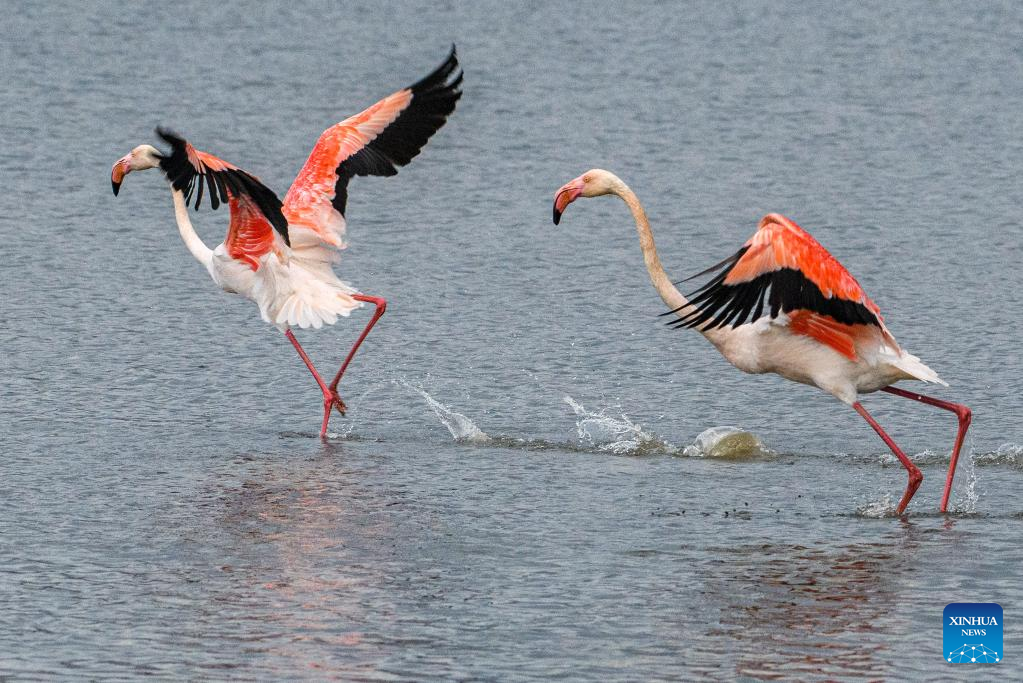 Migrating greater flamingos are seen in Hula Valley, northern Israel, on Dec. 6, 2022. (Ayal Margolin/JINI via Xinhua)