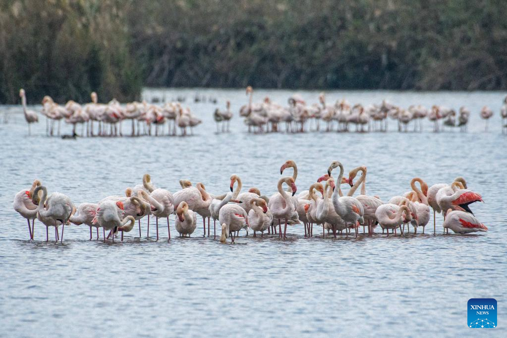 A flock of migrating greater flamingos are seen in Hula Valley, northern Israel, on Dec. 6, 2022. (Ayal Margolin/JINI via Xinhua)