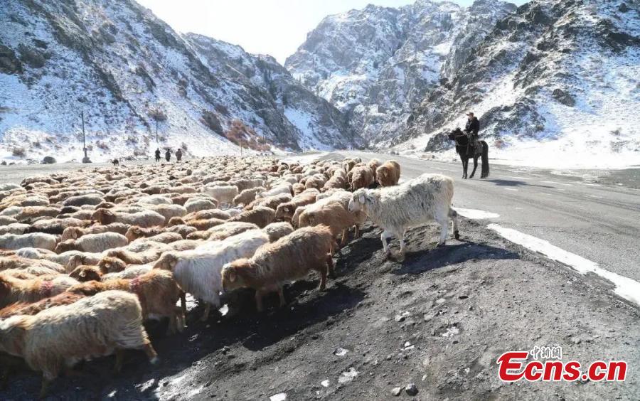 Herders drive livestock heading for a winter pasture in northwest China's Xinjiang Uyghur Autonomous Region. (Photo: China News Service/Yuan Junping)