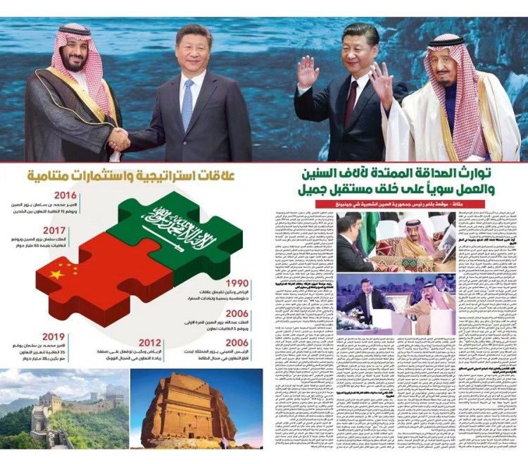 Since the establishment of diplomatic ties, relations between China and Saudi Arabia have maintained robust growth. Most notably, China-Saudi Arabia cooperation has made major headway in the past 10 years. The two sides respect each other's sovereignty and development path, respect each other's history and cultural traditions, support each other in defending national security and stability, and undertake close strategic coordination. Practical cooperation is expanding rapidly. Major projects have been launched one after another, including the Yanbu Aramco Sinopec Refining Company, the Sino-Saudi Gulei Ethylene Complex Project, the Chinese industrial cluster in Jazan Economic City, the Red Sea utilities and infrastructure project, 5G communications, and joint lunar explorations. People-to-people exchanges continue to grow. Chinese language major is now available in four Saudi universities, and optional Chinese language courses are provided in eight middle and primary schools. Hakim &Kong Xiaoxi, the first animated co-production of China and Saudi Arabia, is popular among children, sowing the seed of China-Saudi Arabia friendship in their hearts.