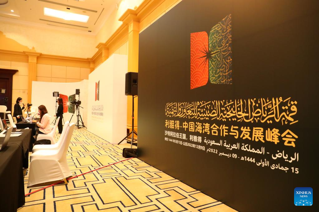 This photo shows a board about the China-Gulf Cooperation Council summit at a media center in Riyadh, Saudi Arabia, Dec. 7, 2022. (Xinhua/Sui Xiankai)