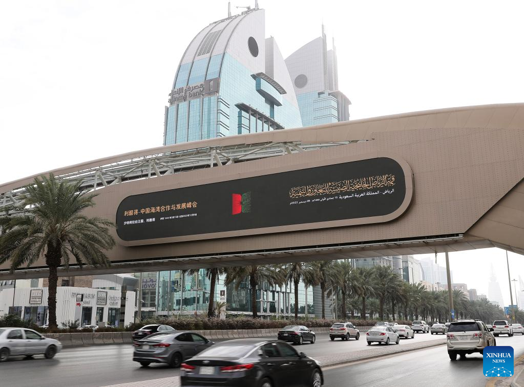 This photo shows a screen display about the China-Gulf Cooperation Council summit on a street in Riyadh, Saudi Arabia, Dec. 7, 2022. (Xinhua/Wang Dongzhen)