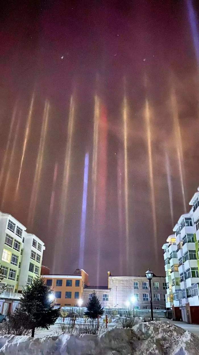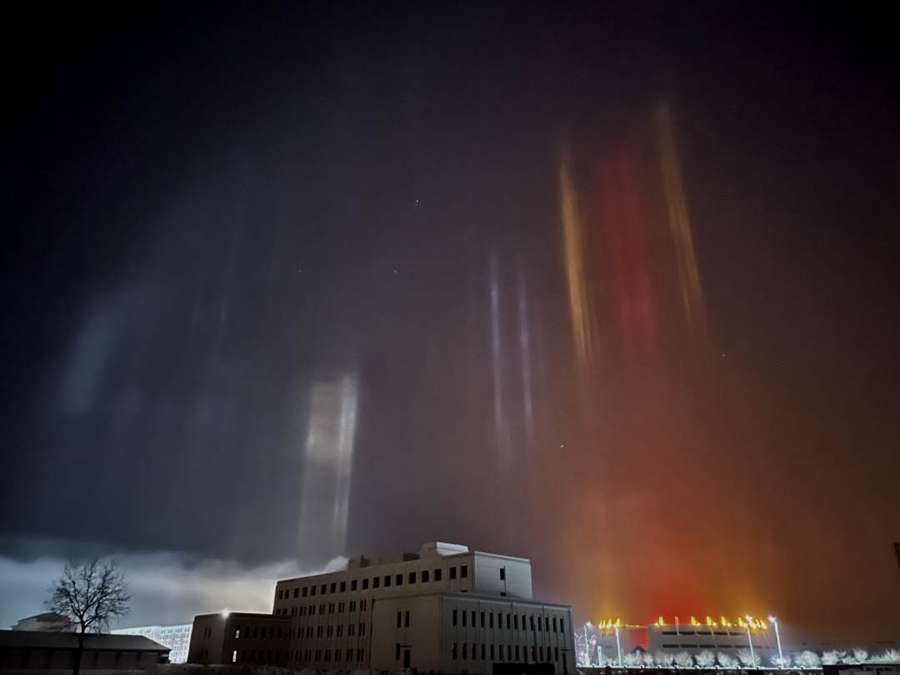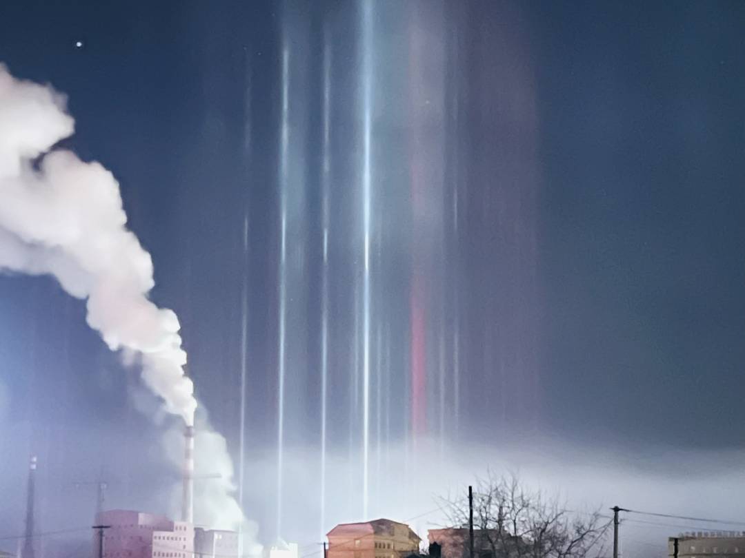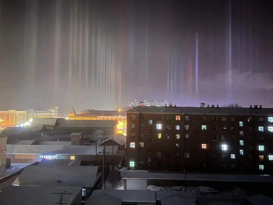 Natural light beams can sometimes be seen on winter nights in cold regions. The rare phenomenon occurs when light meets floating ice particles after snow. The lower the temperature is, the stronger the reflection of the light. On Nov. 27, the lowest temperature in Oroqen Autonomous Banner was about 30 degrees Celsius below zero.