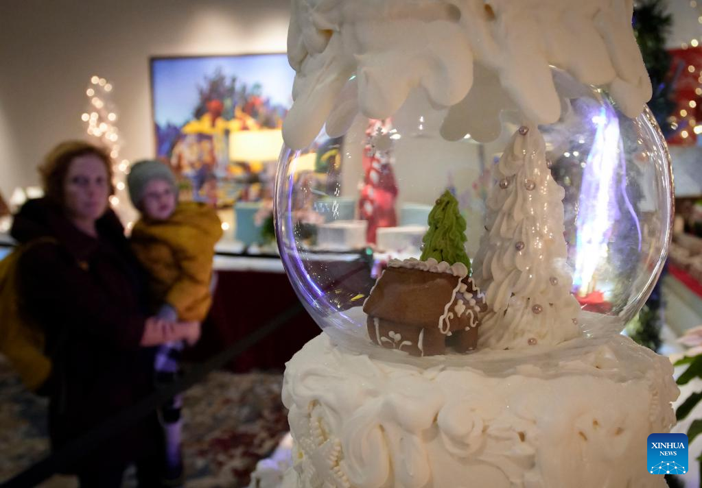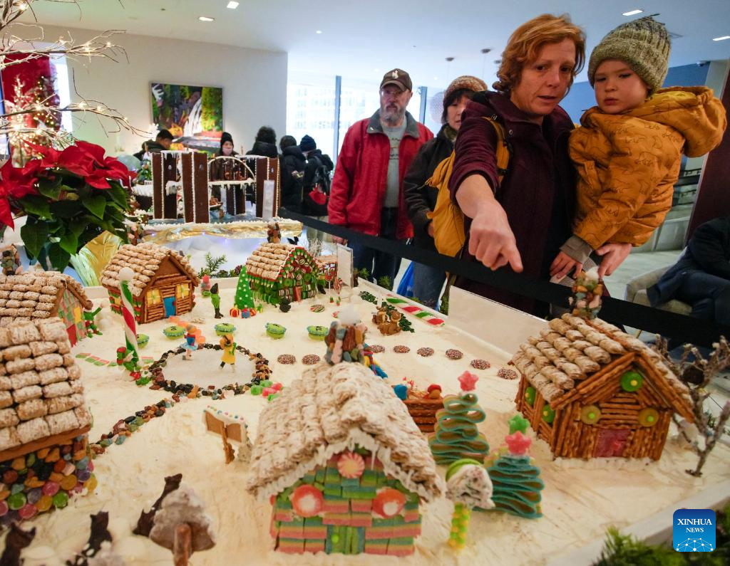 People look at a gingerbread house creation at the 30th Gingerbread Lane event held in Vancouver, British Columbia, Canada, on Dec. 7, 2022. (Photo by Liang Sen/Xinhua)
