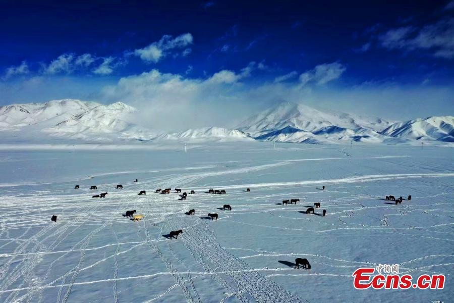 A herd of cattle graze on the snow-covered Bayanbulak grassland in Hejing County, northwest China's Xinjiang Uygur Autonomous Region. Snow turns the grassland into winter wonderland. (Photo: China News Service/Wang Fusheng)