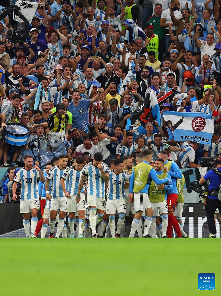 Players of Argentina celebrate their goal during the Quarterfinal between the Netherlands and Argentina of the 2022 FIFA World Cup at Lusail Stadium in Lusail, Qatar, Dec. 9, 2022. (Xinhua/Ding Xu)