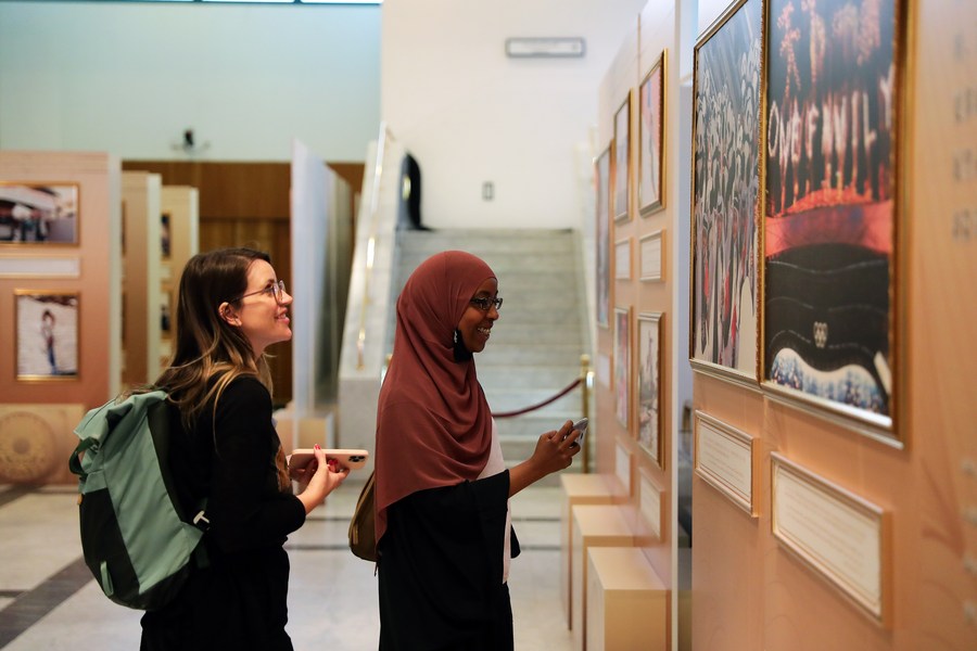 People visit a photo exhibition showcasing the friendly exchanges and cooperation between China and Arab countries in Riyadh, Saudi Arabia, Dec. 7, 2022. (Xinhua/Wang Dongzhen)