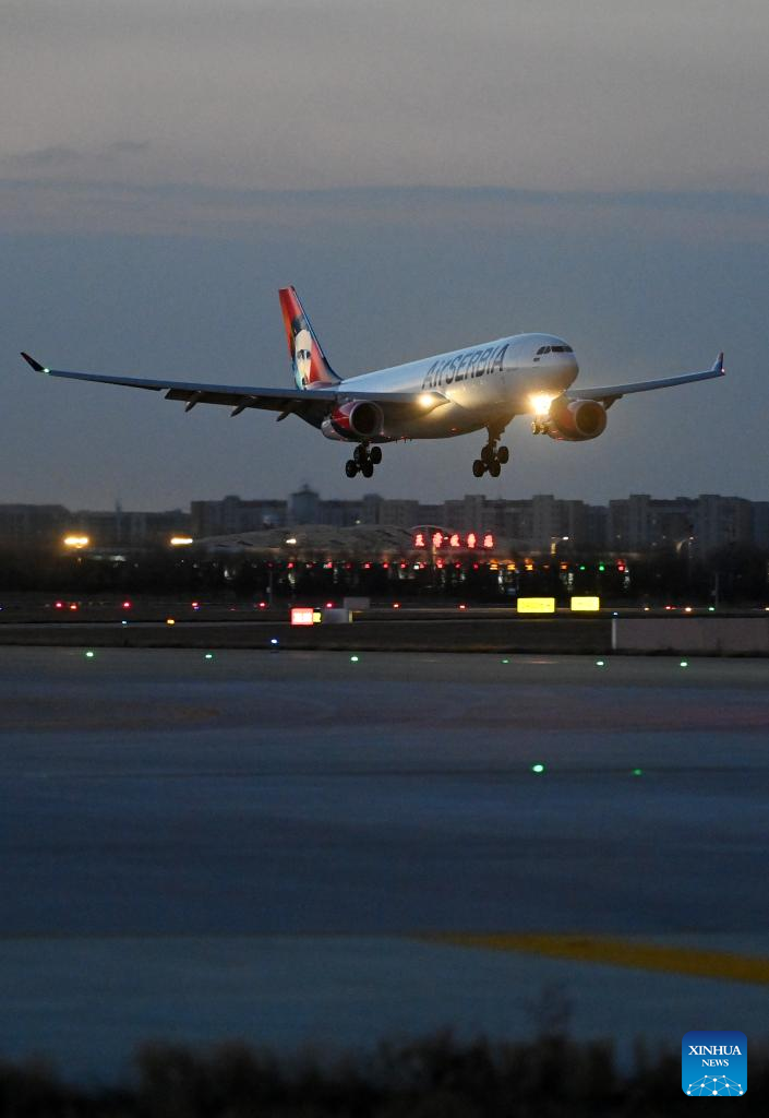 Flight JU702 lands at Tianjin Binhai International Airport in north China's Tianjin, Dec. 10, 2022. The flight carrying about 170 passengers landed at Tianjin Binhai International Airport on Saturday, marking the official opening of the direct flight between Serbia's Belgrade and north China's Tianjin city.