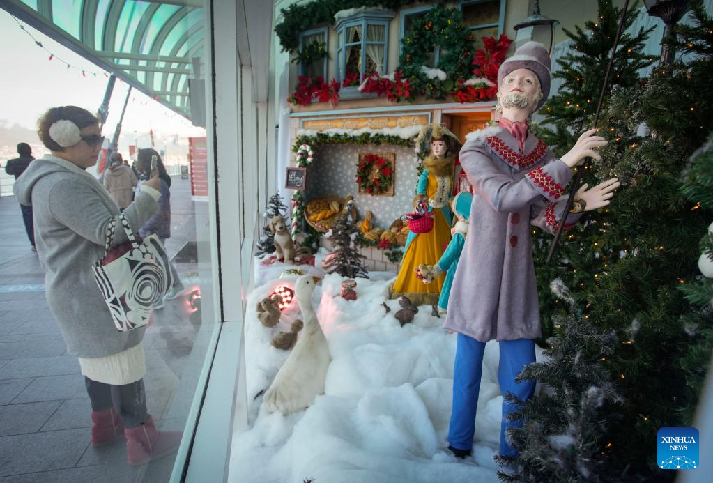 A woman takes photos of vintage Christmas window displays at Canada Place in Vancouver, British Columbia, Canada, on Dec. 12, 2022. The vintage Christmas window displays are now for viewing here as part of the Christmas highlights in Vancouver. (Photo by Liang Sen/Xinhua)